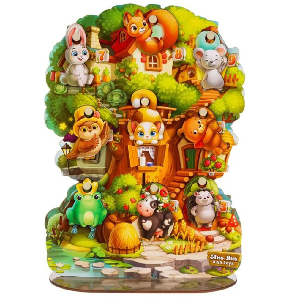 Дерево с подставкой. У каждой плашки с животным (9 животных) есть дырочка, чтобы прикрепить его к домику. Отработка предлогов: предложите ребенку посадить зайчика справа от белки и слева от совы (да, животные ходят в гости). Точно также "сверху и снизу", "кто где живет?".